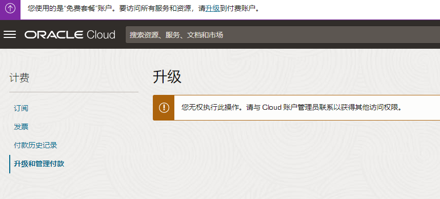wop 发表于 2023-8-30 12:26 你登陆用户控制台 看看是不是每页oci 组管理员权限了 你这个是被移除了oci 云权限 ...