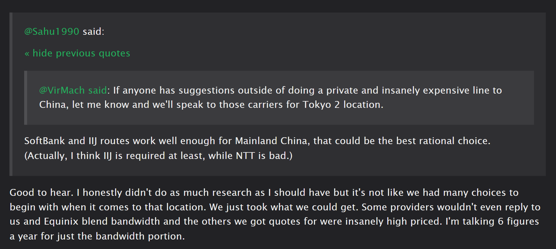 it's not like we had many choices to begin with when it comes to that location. We just took what we could get. Some providers wouldn't even reply to us and Equinix blend bandwidth and the others we got quotes for were insanely high priced.